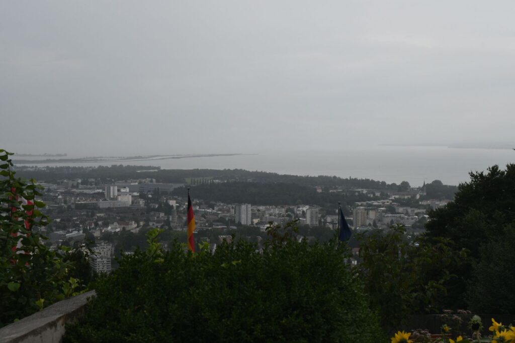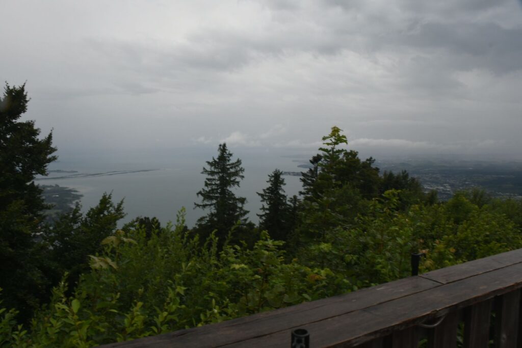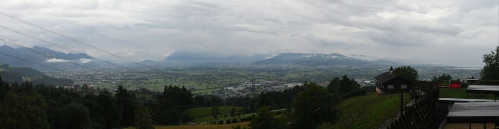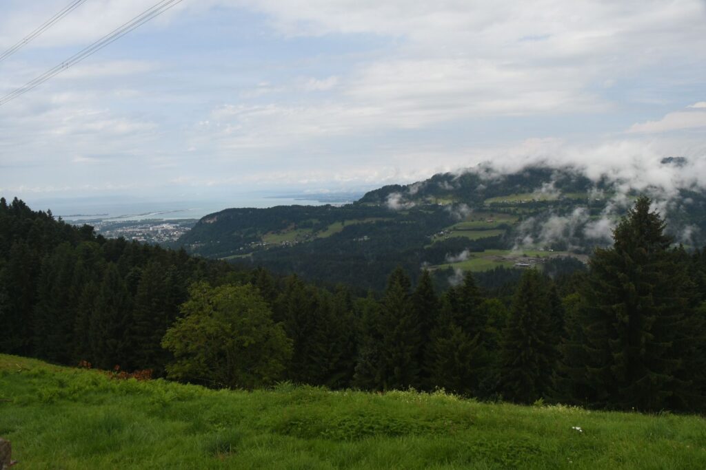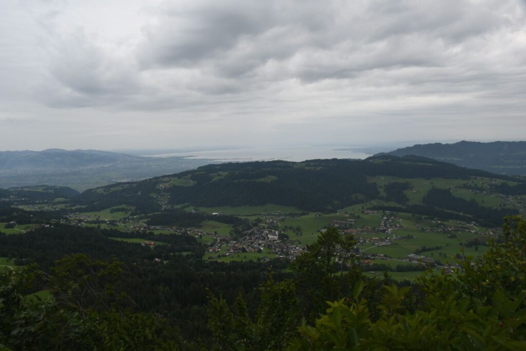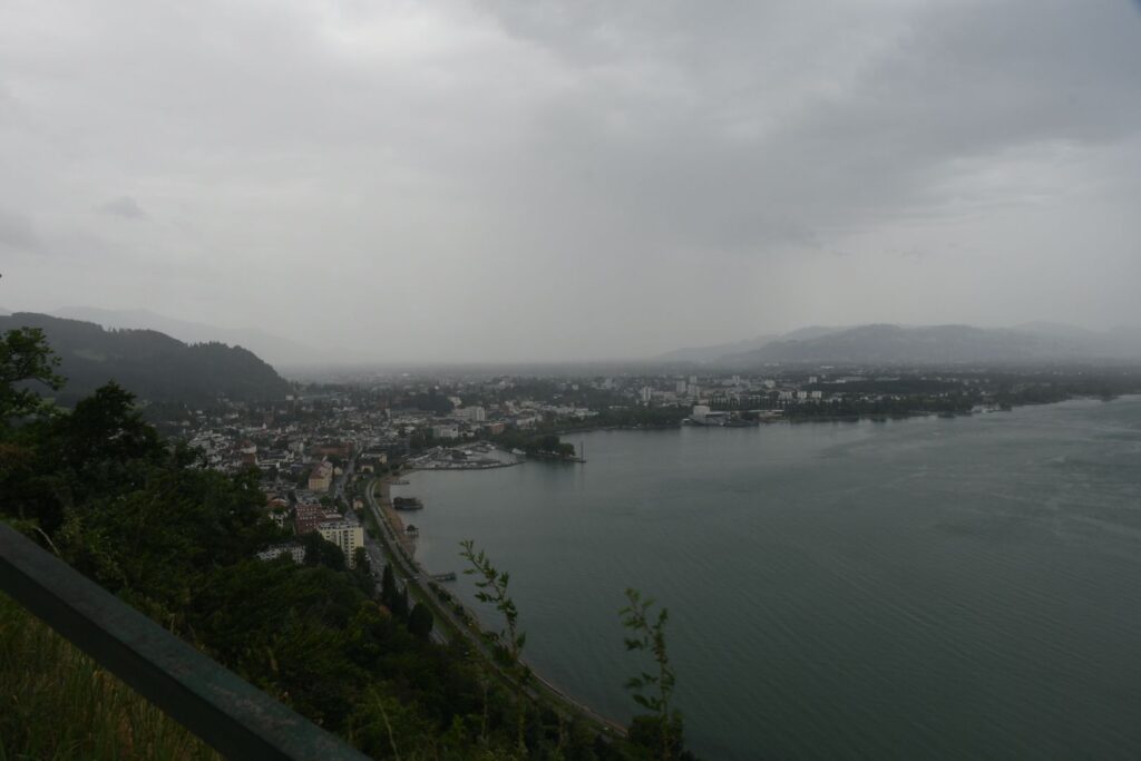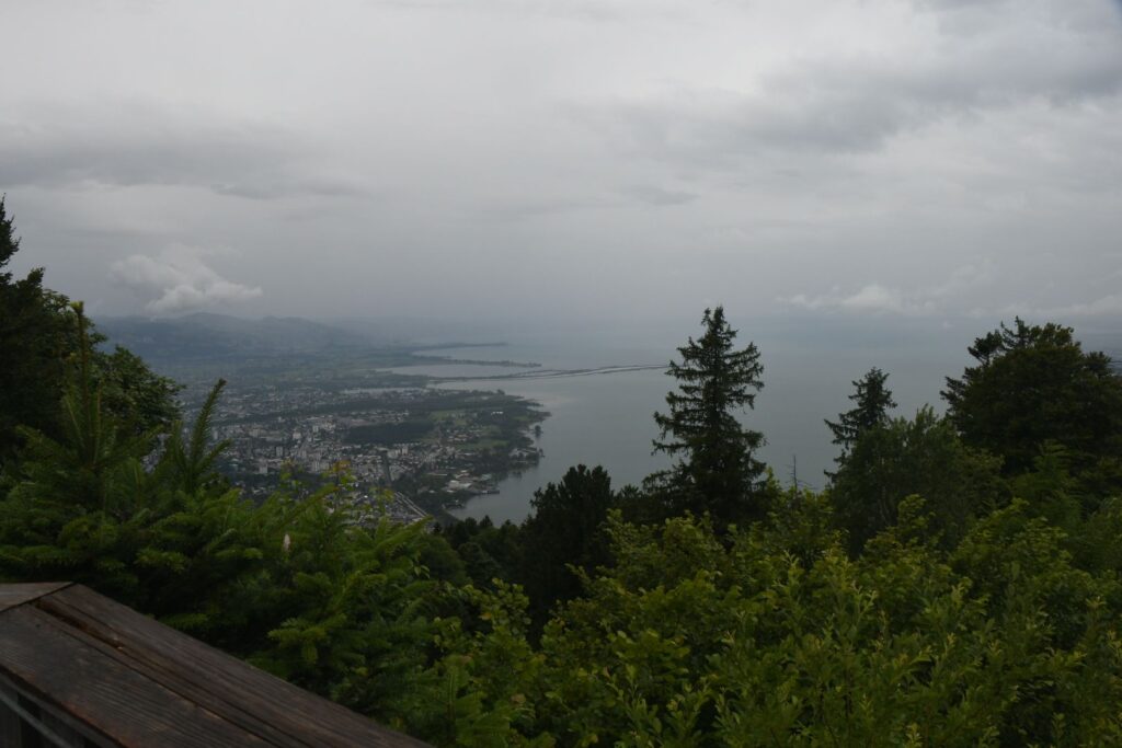 Schon in Lindau packten wir die Regenjacken und Rucksackhüllen aus, dann ging es zunächst am See entlang Richtung Bregenz.  Kurz vor Bregenz bogen wir einmal ab, um noch den Pfänder zu erklimmen, derv Erste 1000 auf dieser Reise. Das Wetter blieb ungemütlich, aber nicht so schlimm wie vorhergesagt. Oben angekommen pausierten wir in der Bergstation, bevor wir wieder bergab ins Tal wanderten, wo es deutlich wärmer und sonniger wurde.