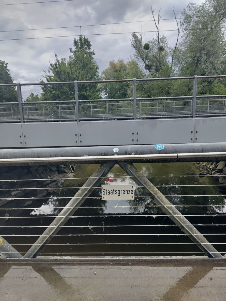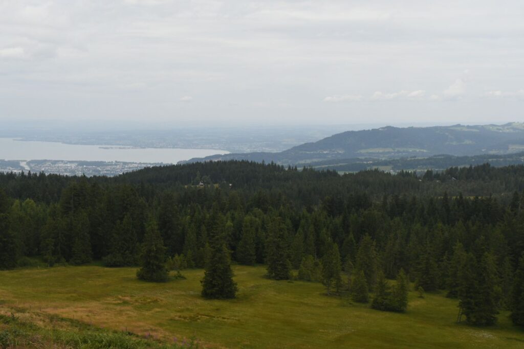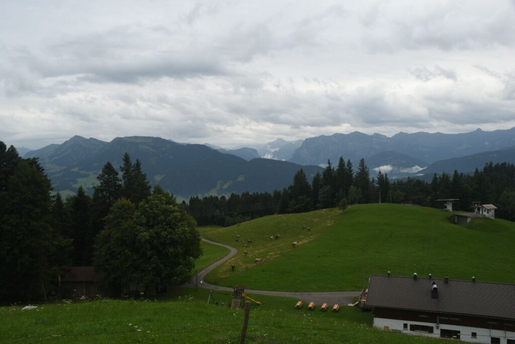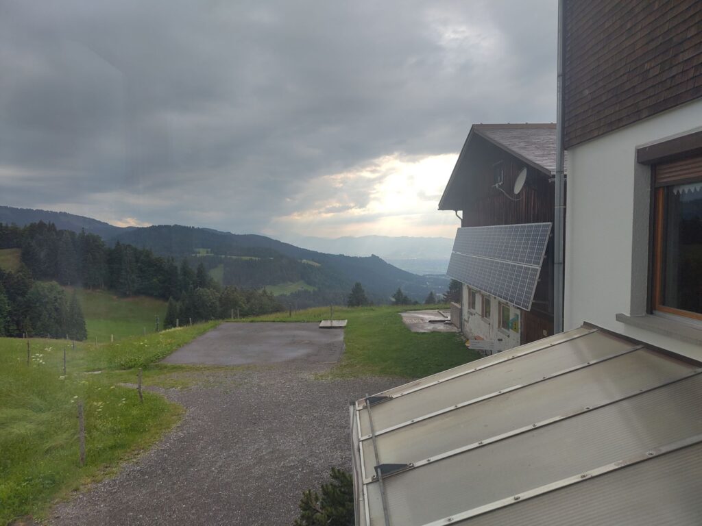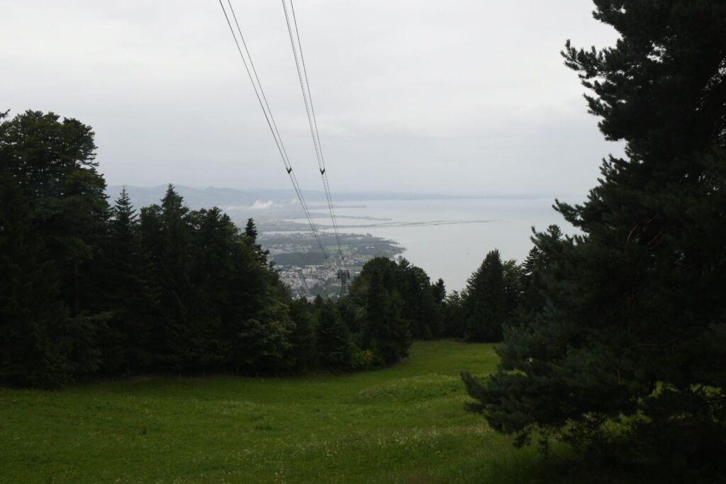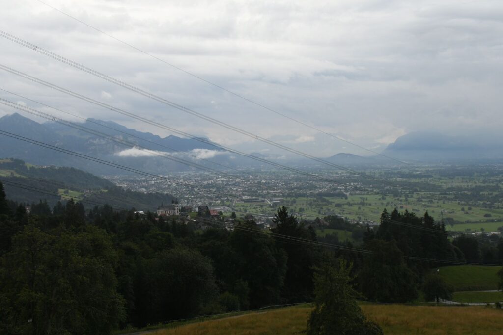 Schon in Lindau packten wir die Regenjacken und Rucksackhüllen aus, dann ging es zunächst am See entlang Richtung Bregenz.  Kurz vor Bregenz bogen wir einmal ab, um noch den Pfänder zu erklimmen, derv Erste 1000 auf dieser Reise. Das Wetter blieb ungemütlich, aber nicht so schlimm wie vorhergesagt. Oben angekommen pausierten wir in der Bergstation, bevor wir wieder bergab ins Tal wanderten, wo es deutlich wärmer und sonniger wurde.