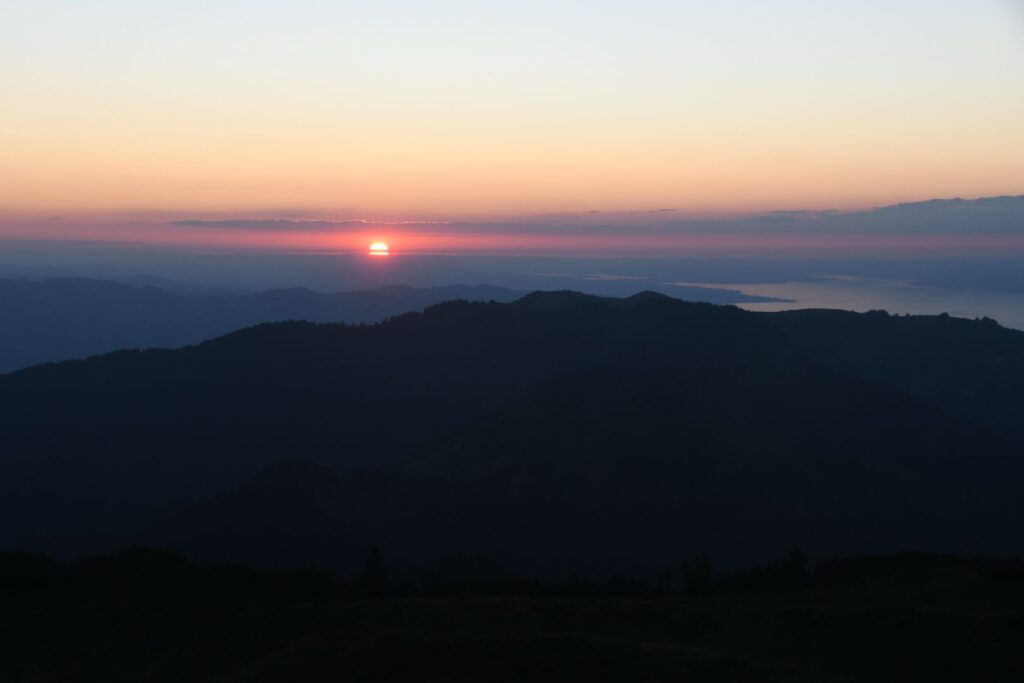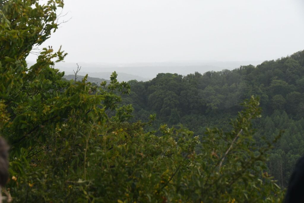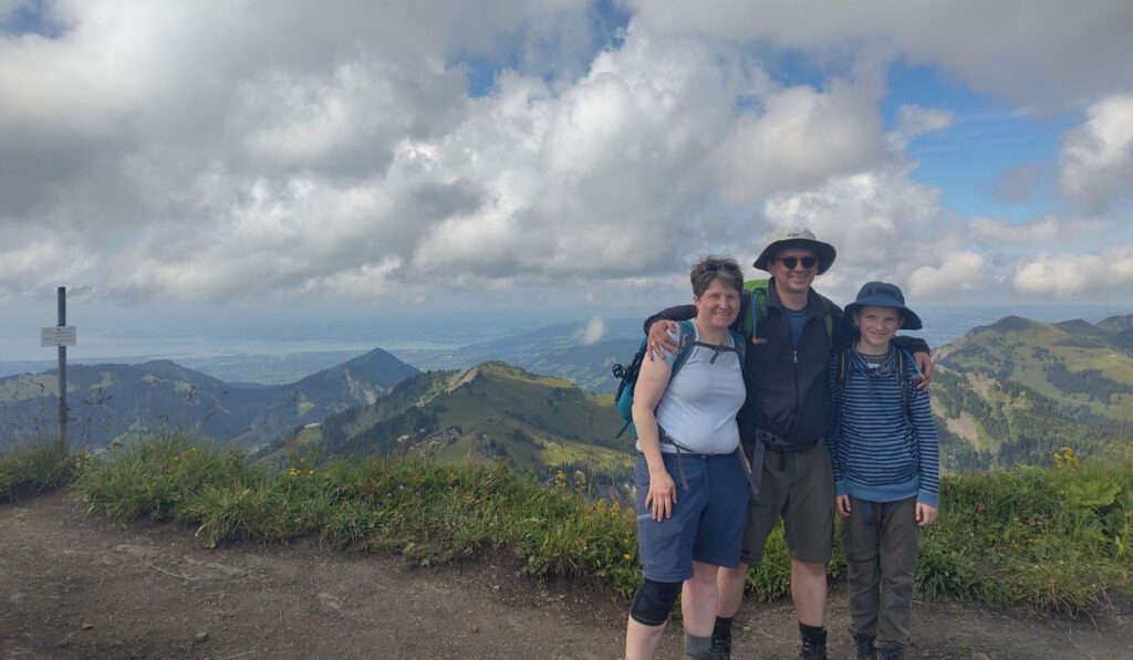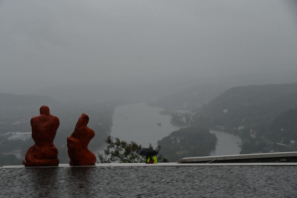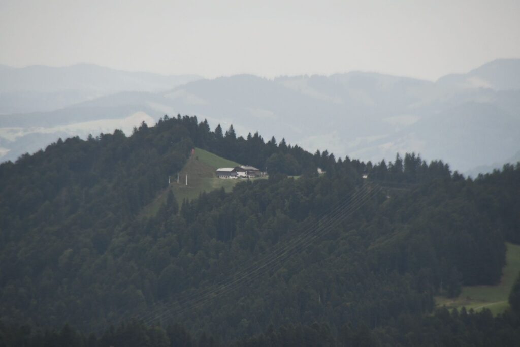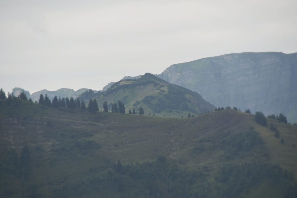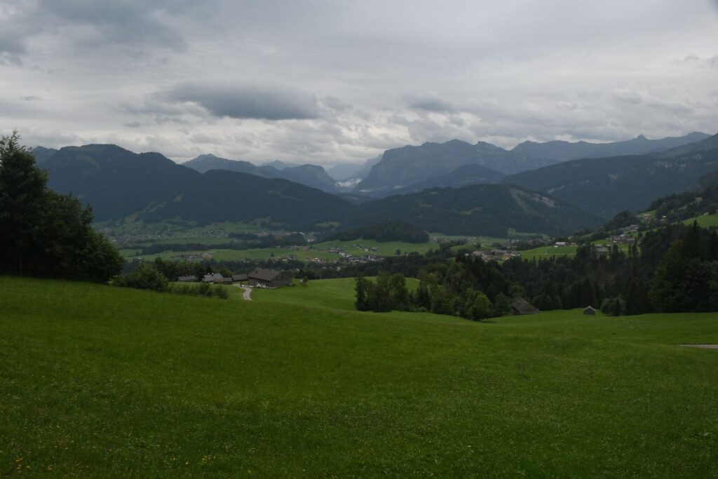 Schon in Lindau packten wir die Regenjacken und Rucksackhüllen aus, dann ging es zunächst am See entlang Richtung Bregenz.  Kurz vor Bregenz bogen wir einmal ab, um noch den Pfänder zu erklimmen, derv Erste 1000 auf dieser Reise. Das Wetter blieb ungemütlich, aber nicht so schlimm wie vorhergesagt. Oben angekommen pausierten wir in der Bergstation, bevor wir wieder bergab ins Tal wanderten, wo es deutlich wärmer und sonniger wurde.