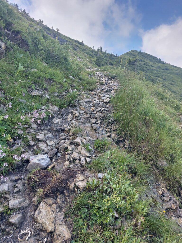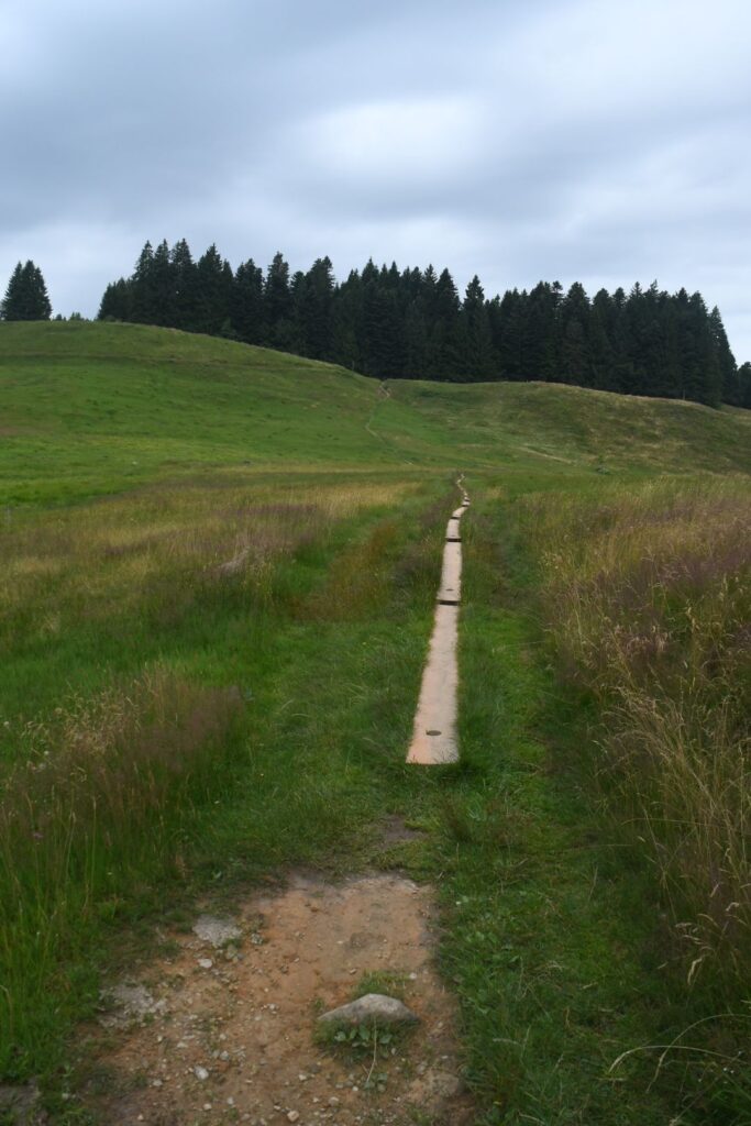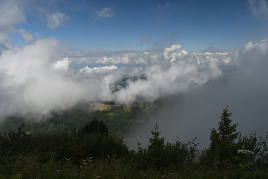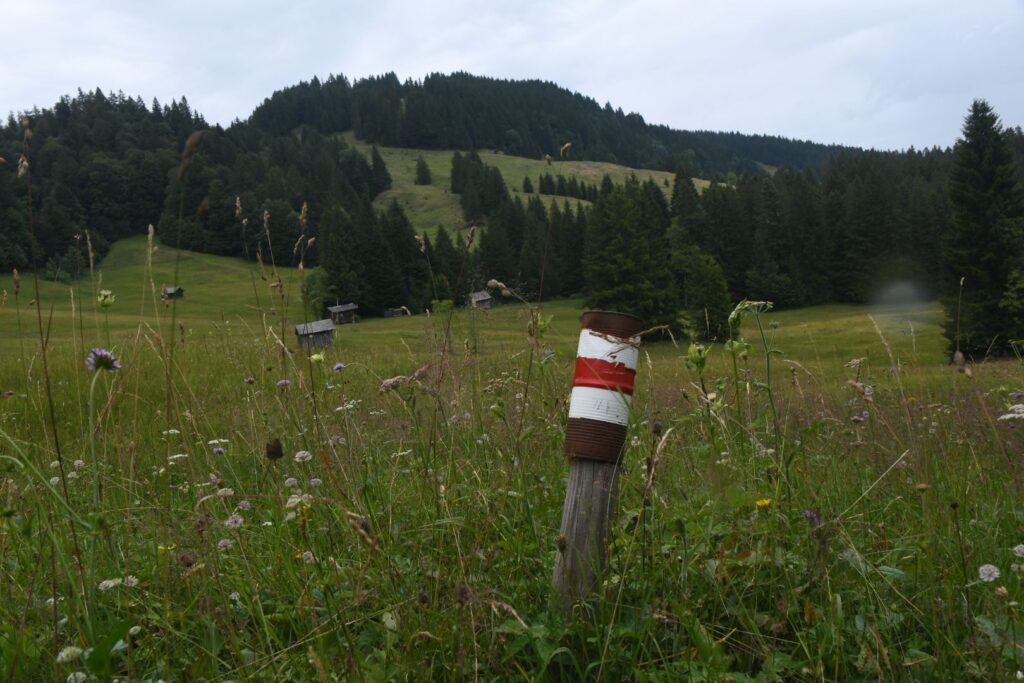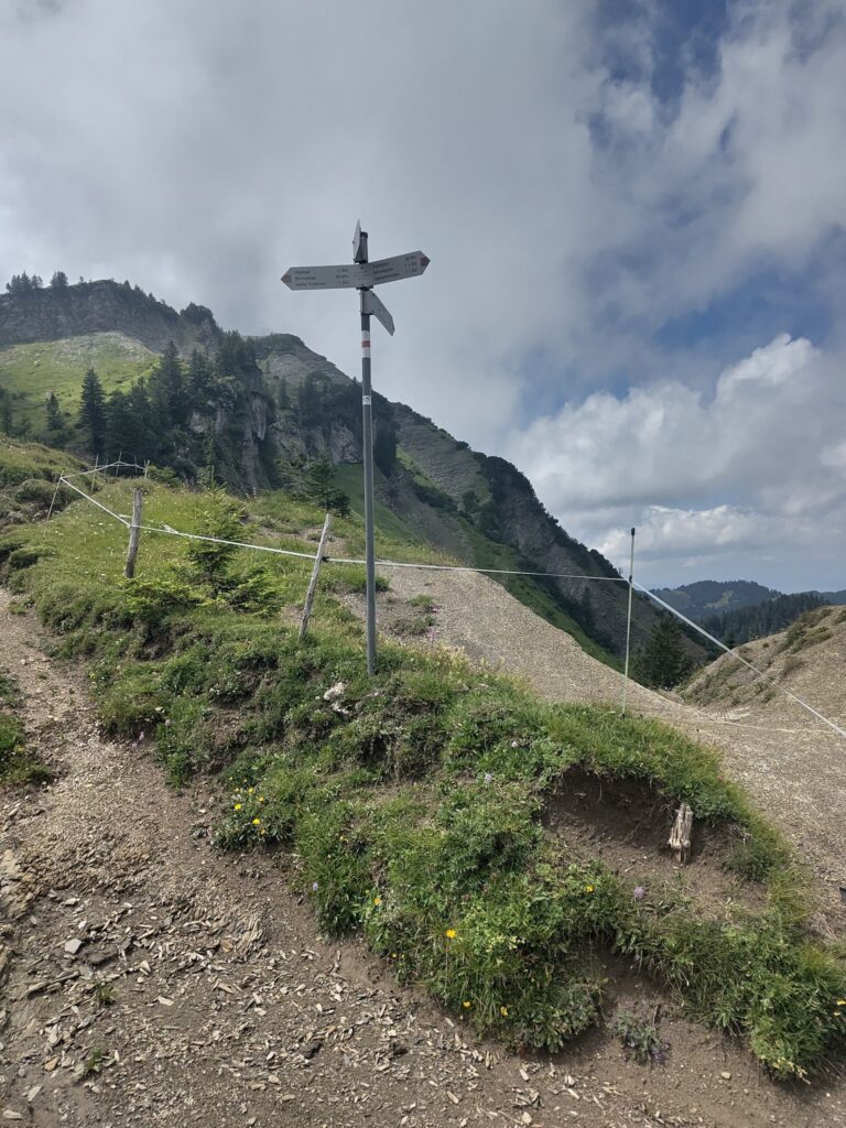 Der Abstieg von der Mörzelspitze und der weitere Weg waren mühsam, weil die Wege durch den Regen matschig und vor allem sehr rutschig waren. Nach 2 1/2 Stunden kam die nächste Zeitangabe für den Hohen Freschen: 1 1/2 Stunden…